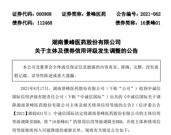 公告显示,2021年6月25日,中诚信国际出具《湖南景峰医药股份有限公司2016年面向合格投资者公开发行公司债券(第一期)跟踪评级报告(2021)》(信评委函字【2021】跟踪1306号),将公司主体信用等级由AA-调降至A,将“16景峰01”的债项信用等级由AA-调降至 A,并将主体和债项列入可能降级的观察名单。