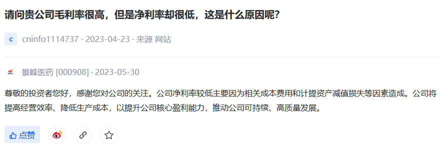 景峰医药解释称,公司净利率较低主因相关成本费用和计提资产减值损失等因素造成。将提高经营效率、降低生产成本,以提升核心盈利能力,推动公司可持续、高质量发展。