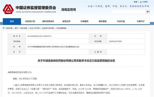 9月13日,湖南证监局在官网挂出《关于对湖南景峰医药股份有限公司采取责令改正行政监管措施的决定》及《关于对叶湘武、丛树芬、欧阳艳丽、毕元、马贤鹏、张军国、刘莉敏采取出具警示函行政监管措施的决定》,剑指景峰医药的虚增资产、利润以及募集资金管理和使用不规范行为。