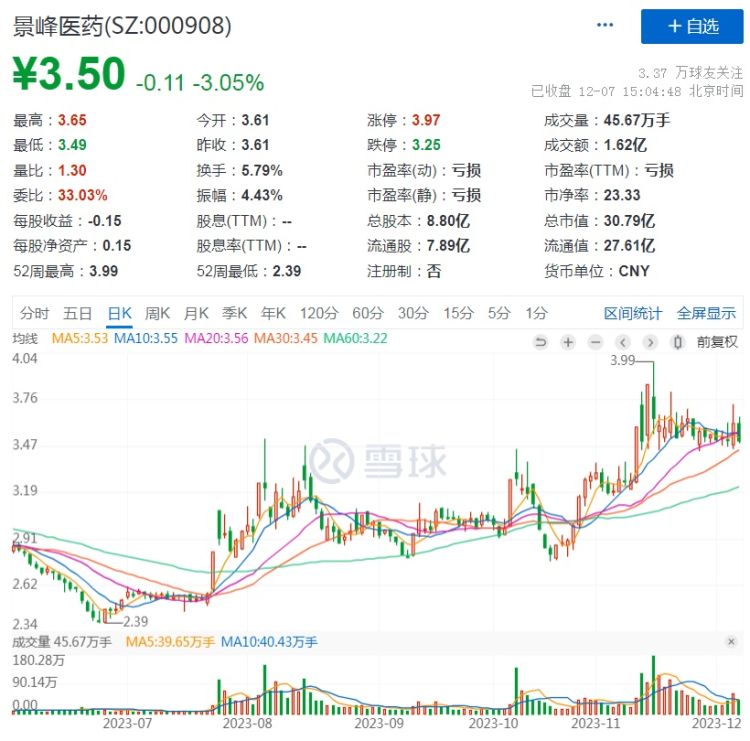 二级市场上,截至7日收盘,景峰医药报3.50元/股,下跌3.05%,总市值30.79亿元。