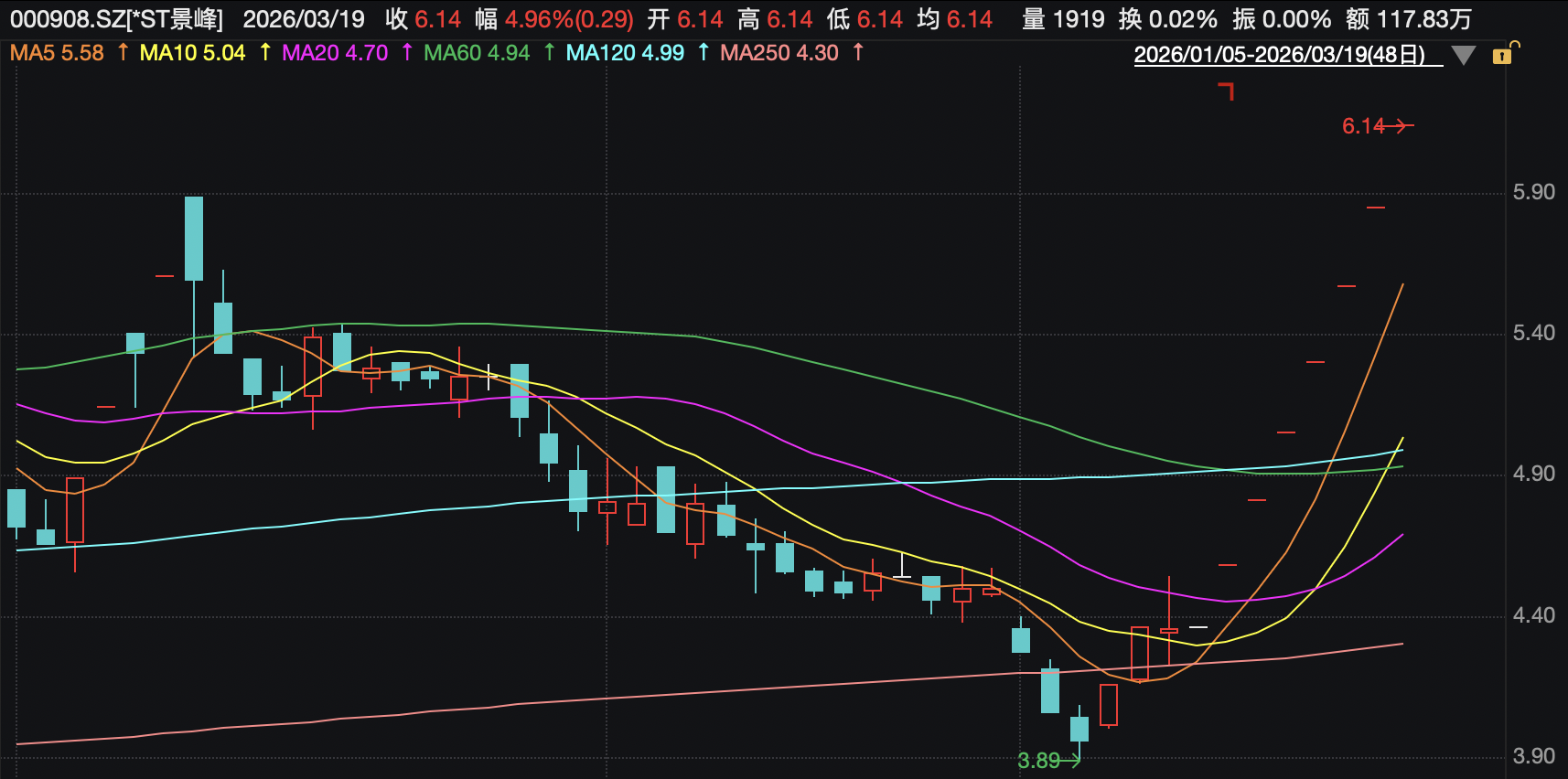 3月19日,*ST景峰股价开盘后再次出现涨停,为6.14元/股。