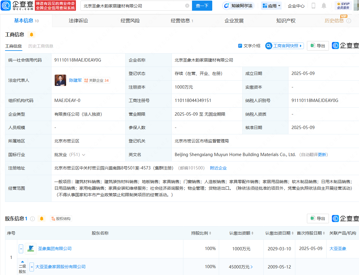 近日,北京圣象木韵家居建材有限公司成立,法定代表人为陈建军,注册资本为1000万元,经营范围包含:建筑材料销售;建筑装饰材料销售;地板销售;家具销售;门窗销售;人造板销售;家具零配件销售;家居用品销售等。该公司由大亚圣象(000910)间接全资持股。