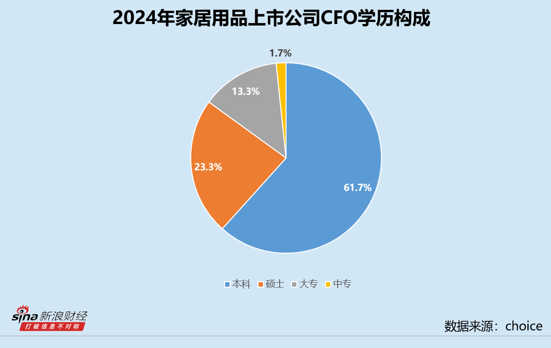 就学历构成而言,若剔除未披露具体信息的德力股份,在余下的60位家居用品上市公司CFO中,约61.7%为本科学历,硕士和大专分别占比23.3%、13.3%。德尔未来财务总监吴惠芳最高学历为中专。