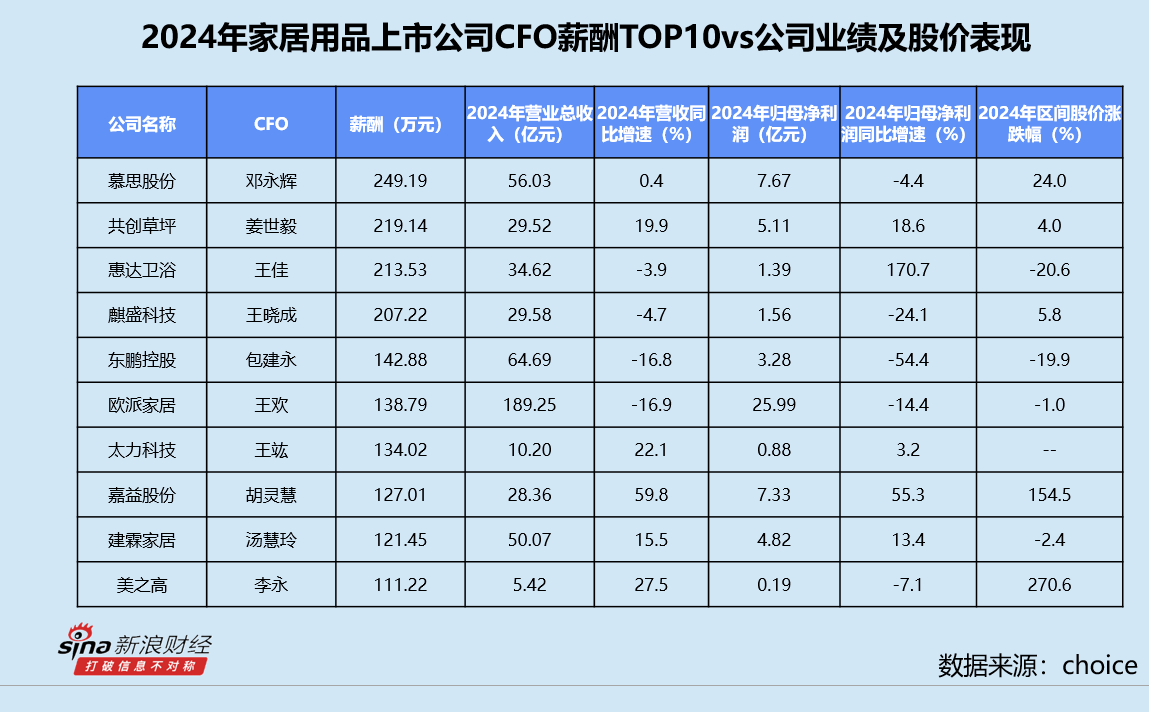 慕思股份邓永辉以249.19万元稳坐第一,约为第二名共创草坪姜世毅年薪的1.14倍。财报显示,邓永辉自2023年12月开始担任公司副总经理、财务总监一职,截至2024年末持有公司10万股股份。薪酬最低的是德艺文创谢欣欣,当期从公司获得税前报酬总额仅为25.99万元,同比微降1.9%。报告期内,她未持有德艺文创任何股份。