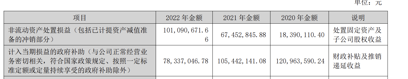 另外,在上述业绩期内,公司计入当期损益的政府补助金额和处置资产产生的收益占净利润的比例较大。2020年-2022年,公司政府补助分别为1.21亿元、1.05亿元、7833.7万元,非流动资产处置损益分别为1839万元、6745.28万元、1.01亿元。