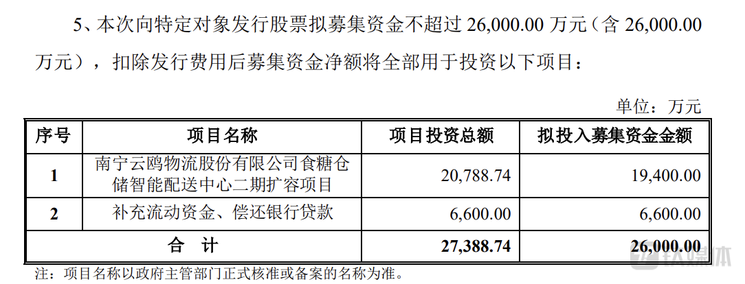 来源:钛媒体7月19日晚间,老牌糖企南宁糖业(000911.SZ)发布公告,公司拟向特定对象发行股票募资不超过2.6亿元,扣除发行费用后募集资金净额将用于南宁云鸥物流股份有限公司食糖仓储智能配送中心二期扩容项目(下称项目一)、补充流动资金、偿还银行贷款。
