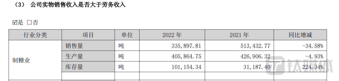 不仅如此,公司的制糖销量和产量均出现了下滑。2022年,公司制糖的销量和产量分别为33.59万吨、40.59万吨,同比下滑34.58%、4.93%。