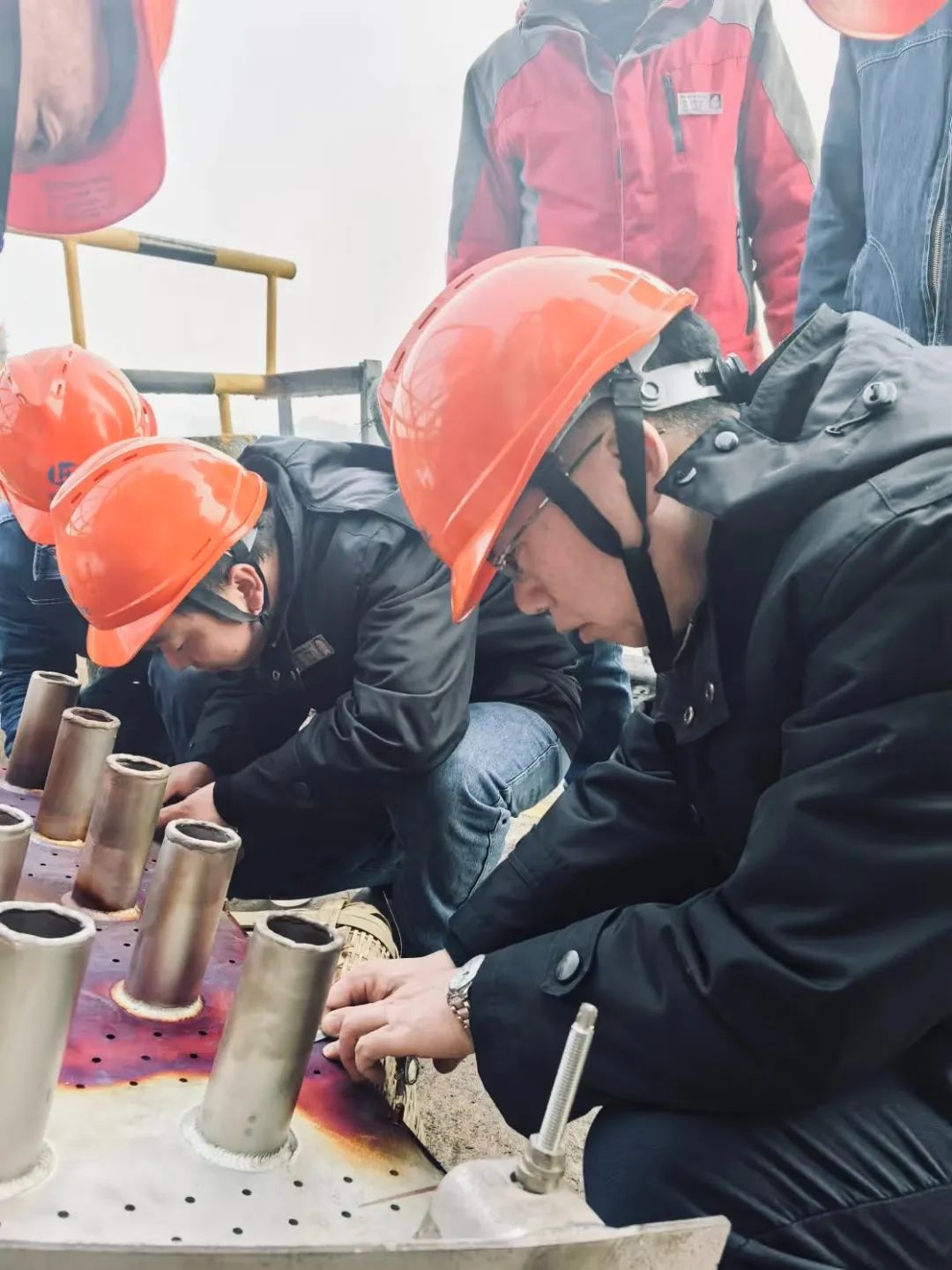 在繁忙而井然有序的大修现场,傅利才与尿素车间党支部书记王涛进行了深入的交流,认真听取了技术管理人员关于大修工作进度的汇报,详细询问了现场工作开展情况,对202-C卸下的塔顶分布器异常附着物问题进行了细致的查看与讨论,并提出了宝贵的意见和建议。