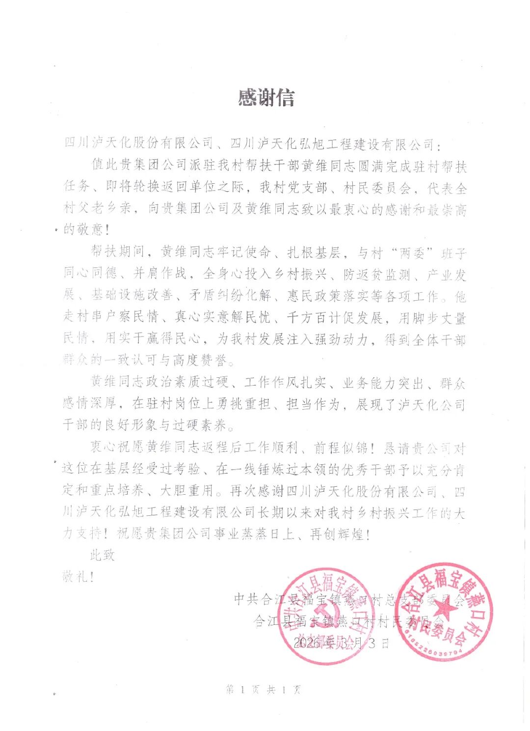 感谢信中写道:“黄维同志政治素质过硬、工作作风扎实、业务能力突出、群众感情深厚,在驻村岗位上勇挑重担、担当作为,展现了泸天化干部的良好形象与过硬素质。”一句句真挚话语,既是对黄维同志履职尽责的肯定,更是对泸天化扎实开展帮扶工作的赞誉。