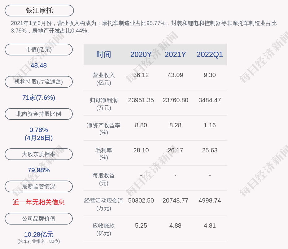 钱江摩托(SZ 000913,收盘价:10.69元)4月27日晚间发布一季度业绩公告称,2022年第一季度营收约9.3亿元,同比增加1.52%;净利润约3484万元,同比减少40.65%;基本每股收益0.08元,同比减少38.46%。