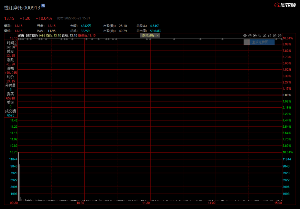 5月23日,钱江摩托(000913.SZ)一字涨停,截至收盘,封单量超52000手,封单额近7000万元,日内成交额4242万元,换手率仅为0.71%。