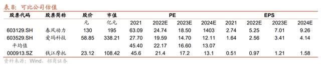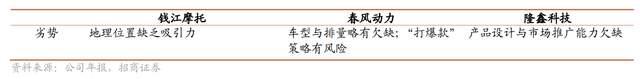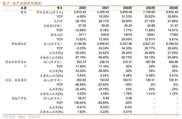 我们预计两轮摩托车业务 2022~2024 年营业收入分别为 52.48 亿元、66.21 亿元、83.69 亿元,同比增长 34.33%、26.17%、26.40%;摩托车配件及加工业务 2022~2024 年营业收入分别为 3.10 亿元、3.88 亿元、4.85 亿元,同比增长 30%、25%、25%。