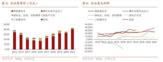 2021 年,两轮摩托车毛利率为 25.62%,同比下降 9.60%,系大宗原材料价格大幅上涨所致;摩托车配件及加工毛利率高达 38.06%,同比增长 15.35%,达到毛利率最高点;锂电池与房地产开发业务毛利率分别为 22.78%、8.03%,均低于摩托车业务。