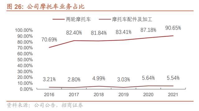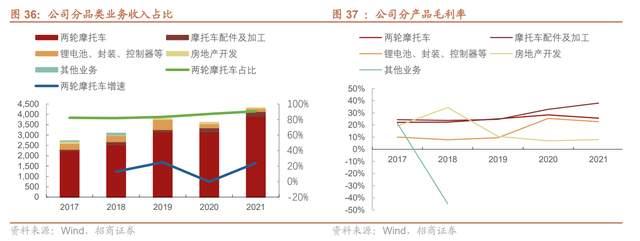 近五年来,两轮摩托车及配件业务两项业务的毛利率稳定超过 20%。2021 年,公司两轮摩托车业务营业收入 39.07 亿元,收入构成占比超过总营收的 90%。