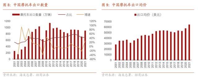 近年来,我国摩托车出口均价呈现稳步增长的趋势,并于 2021 年达到最高价 6.43 万美元,同比增长 11.90%。我国摩托车在国外市场的认可度不断提高,具备广阔的发展前景。