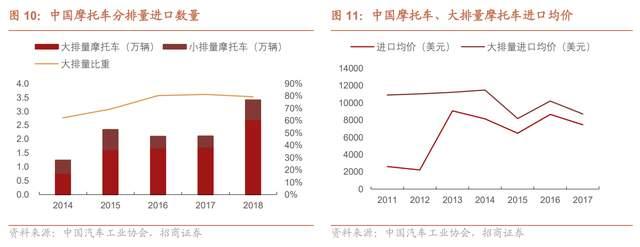 摩托车进口规模小,大排量占主流且进口均价趋于降低。