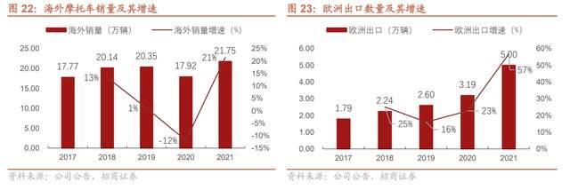 2021 年公司出口 21.75 万辆,同比上升 21.37%,其中大排量出口约 5.22 万台,同比增长约 34.85%。欧洲市场出口量超过 5 万台,增长 56.6%,非欧市场增长 32.83%。