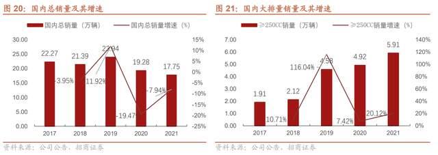 2021年,我国大排量摩托车销量 33.3 万辆,占摩托车总销量的 4.87%,同比增长 65.80%。摩托车的运动、休闲、娱乐属性成为年青人群的首要选择,这促使国内摩托车文化生活的快速形成,以运动、休闲、娱乐为主的中大排量摩托车市场潜力凸显。