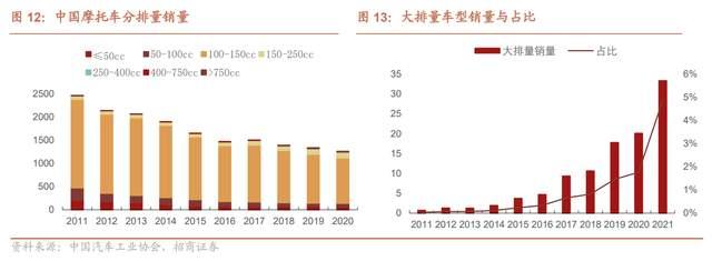 小排量车型需求降低,大排量车型市场扩张。随着我国经济发展,我国摩托车市场的休闲娱乐文化逐步形成,消费者对摩托车的需求从工具属性逐步过渡到休闲娱乐属性。