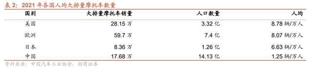 从人均消费量来看,日本、欧洲和美国中大排量摩托车年人均消费量在 6.6~8.8 辆/万人之间,而我国人均销量仅 1.25 辆/万人,参照发达国家和地区,我国 250cc 以上中大排量摩托车销量还有极大提升空间,市场潜力巨大。