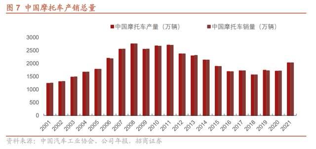 我国摩托车市场规模自 2001 快速增长,年产销量在 2008 年达到顶峰,实现 2750.11/2750.20 万辆。由于电动自行车和汽车的快速发展对摩托车起到替代作用,以及我国限摩、禁摩政策的广泛实施,2008 年之后国内摩托车产销量整体呈现萎缩趋势,于 2018 年到达最低点 1557.75/1557.05 万辆,分别较 2008 年下降 46.36%/46.38%。