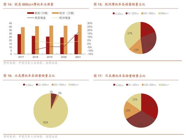 大排量占比远低于欧美,内销结构与日本类似。欧美发达国家已经完成摩托车车型从代步型到消费型、大排量摩托车转变,大排量占据摩托车市场的主流。其中欧洲市场 250cc 以上的占有率超过 50%;北美市场 250cc 以上的占有率超过 90%。日本国内各排量摩托车的内销结构与我国类似,仍以小排量为主。