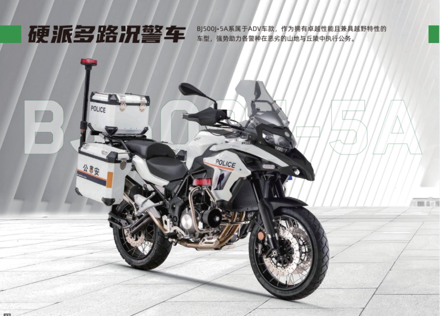 以国内首款四缸警车为定位,BJ600J-5A搭载600CC直列四缸电喷水冷发动机。精致大方的双LED大灯设计完美融合国际元素的照明和警灯系统,高位舒适把手和配备4G防水执法记录仪和主辅双电瓶设计,全方位满足警务工作所需。倒置式前减震和27L超大油箱充分展现了它的硬派多路况越野能力和卓越的耐用属性。
