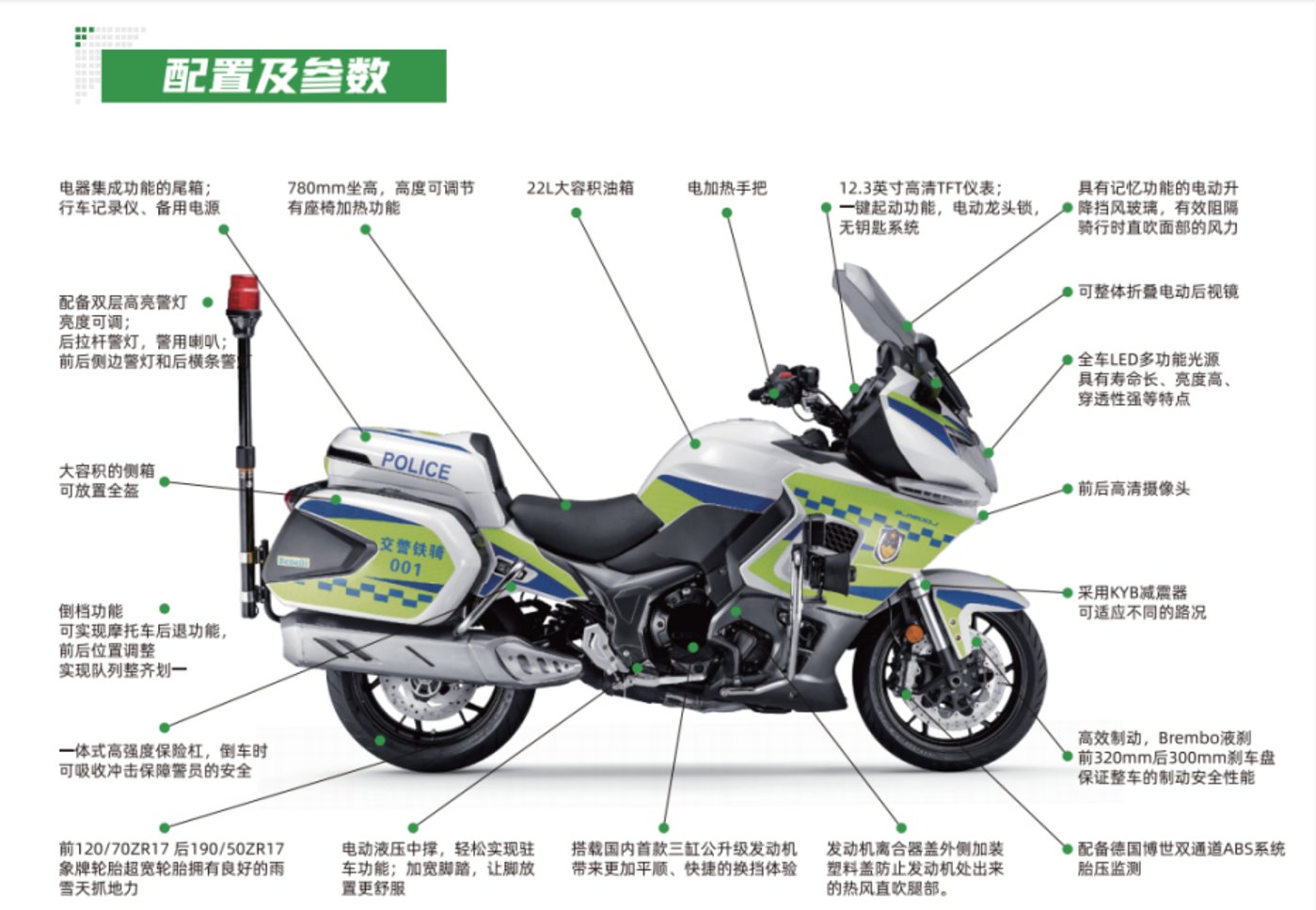 作为国内首款三缸公升级巡航警车,BJ1200J在摩托圈中独具一格,充满力量感的流线型车身设计释放出凌驾绝伦的磅礴气势。220km/h最高设计时速和前320mm、后300毫米刹车盘充分彰显了其礼宾护卫车定位。具有记忆功能的电动升降挡风玻璃和可整体折叠电动后视镜充分展现了钱江摩托在制造工艺和产品质量上的精益求精。