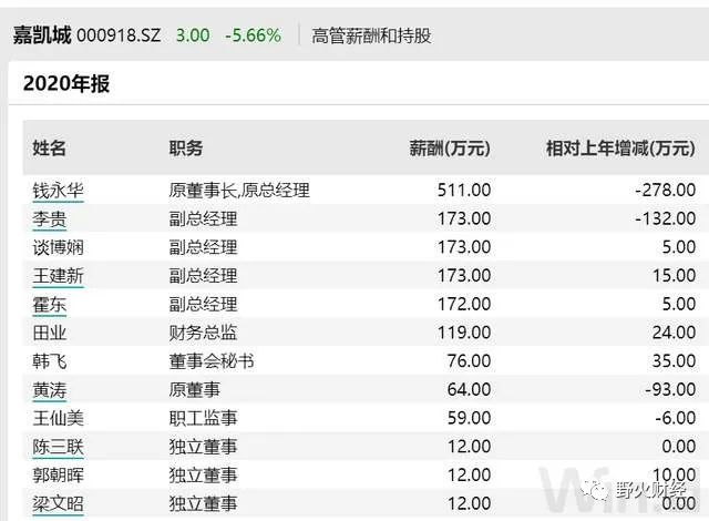 李春皓在嘉凯城前任总经理,即钱永华,于今年1月卸任,他同时还辞掉董事长等所有职务。钱永华任职时间稍长,从2019年4月至2021年1月,大约21个月时间,他去年薪酬虽然比2019年少278万元,但是仍然高达511万元。