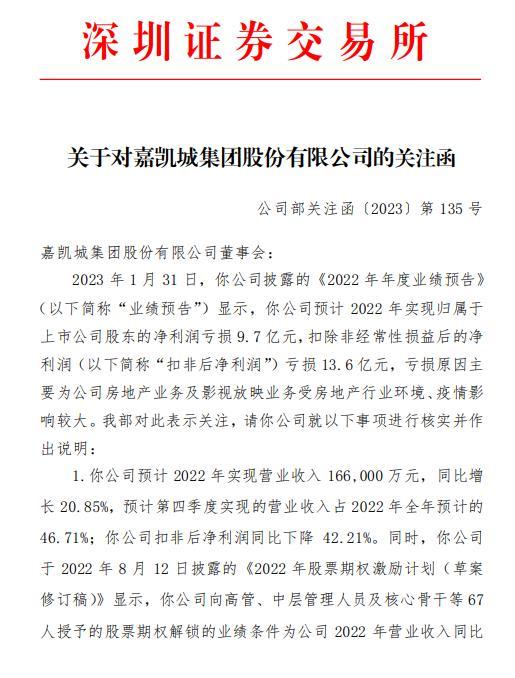 此外,关注函还要求嘉凯城说明公司是否存在通过突击大额确认收入以达到对应期权解锁条件的情形。