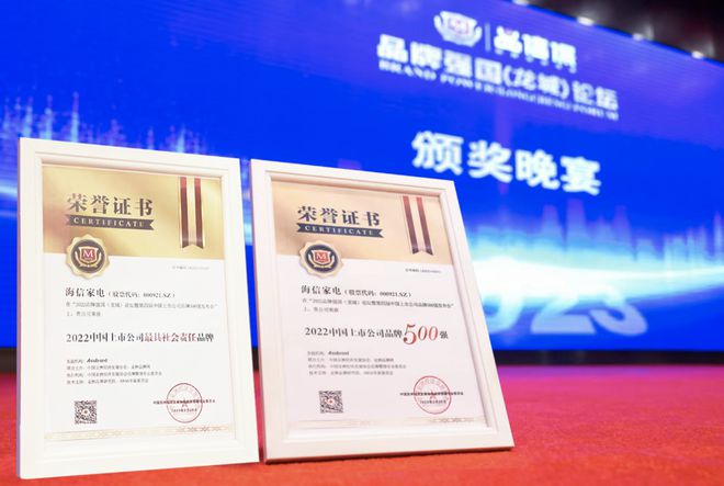 近日,由专业品牌评价机构Asiabrand发起,中国亚洲经济发展协会和亚洲品牌网联合主办的“2022品牌强国(龙城)论坛暨第四届中国上市公司品牌500强发布会”在山西太原隆重举行,海信家电(SZ000921,HK 00921)凭借稳健的经营态势、优秀的品牌实力、高度的社会责任感,同时斩获“2022中国上市公司品牌500强”和“2022中国上市公司最具社会责任品牌”两项荣誉,赢得行业权威认可!