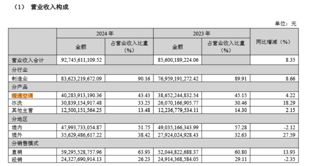 若拉长时间周期,可看到2022年至2024年,海信家电暖通空调实现收入分别为345亿、386.52亿、402.84亿,同比分别增长13.48%、12.04%、4.22%,占比约从47%下降至43%。