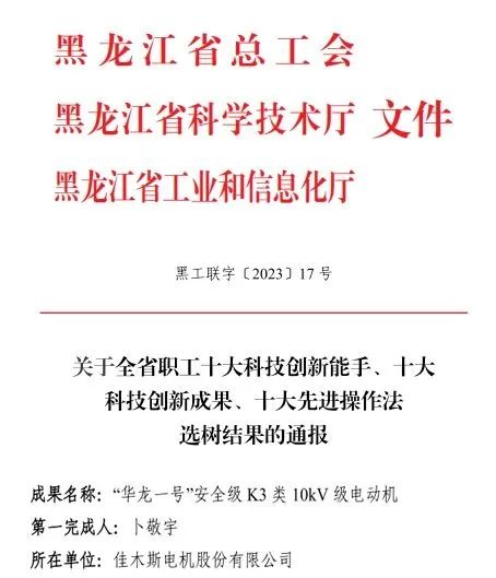 近日,黑龙江省总工会、省科学技术厅、省工业和信息化厅发布了全省职工“十大科技创新能手、十大科技创新成果、十大先进操作法”选树名单,哈尔滨电气集团佳木斯电机股份有限公司(以下简称“佳电股份”)《“华龙一号”安全级K3类10kV级电动机》成果喜获“十大科技创新成果”殊荣。