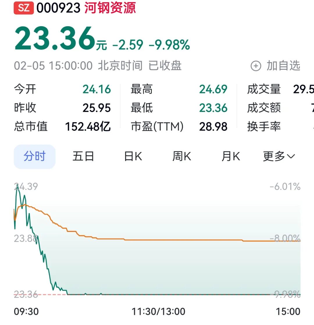 2026年2月5日,河钢资源跌停,报23.36元/股,跌幅为9.98%。