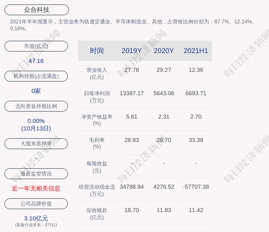 2021年半年报显示,众合科技的主营业务为轨道交通业、半导体制造业、其他,占营收比例分别为:87.7%、12.14%、0.16%。