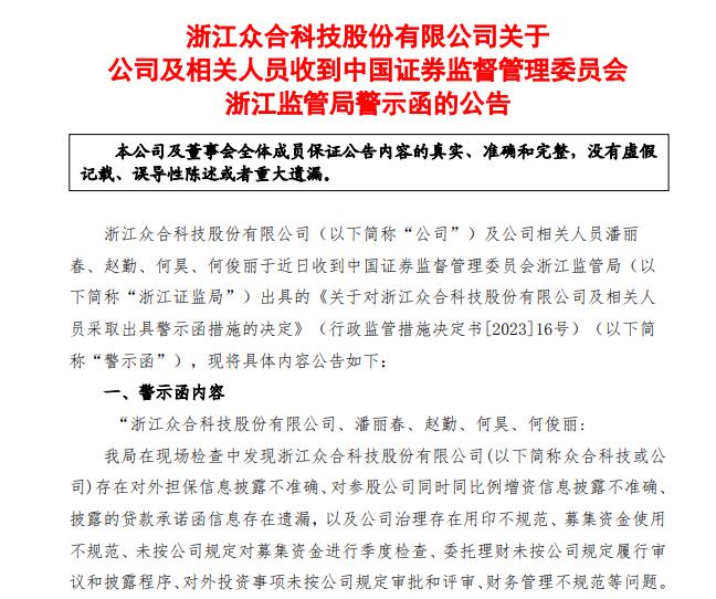 涉募集资金使用不规范、财务管理不规范等问题,众合科技及相关责任人被浙江证监局出具警示函。