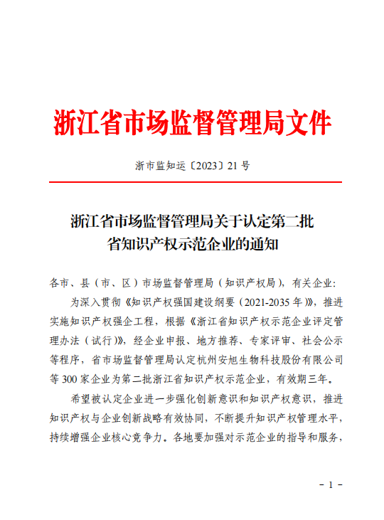 “浙江省知识产权示范企业”评定由浙江省市场监督管理局(浙江省知识产权局)组织实施,旨在培育一批具备市场竞争优势的知识产权强企,高质量推进企业知识产权保护和运用工作,强企先行、示范引领、典型带路。获评企业能有效运用知识产权制度,提升知识产权价值和核心竞争力,是在创造质量、运用效益、保护效果和管理效能方面具备典型示范意义的知识产权密集型企业。