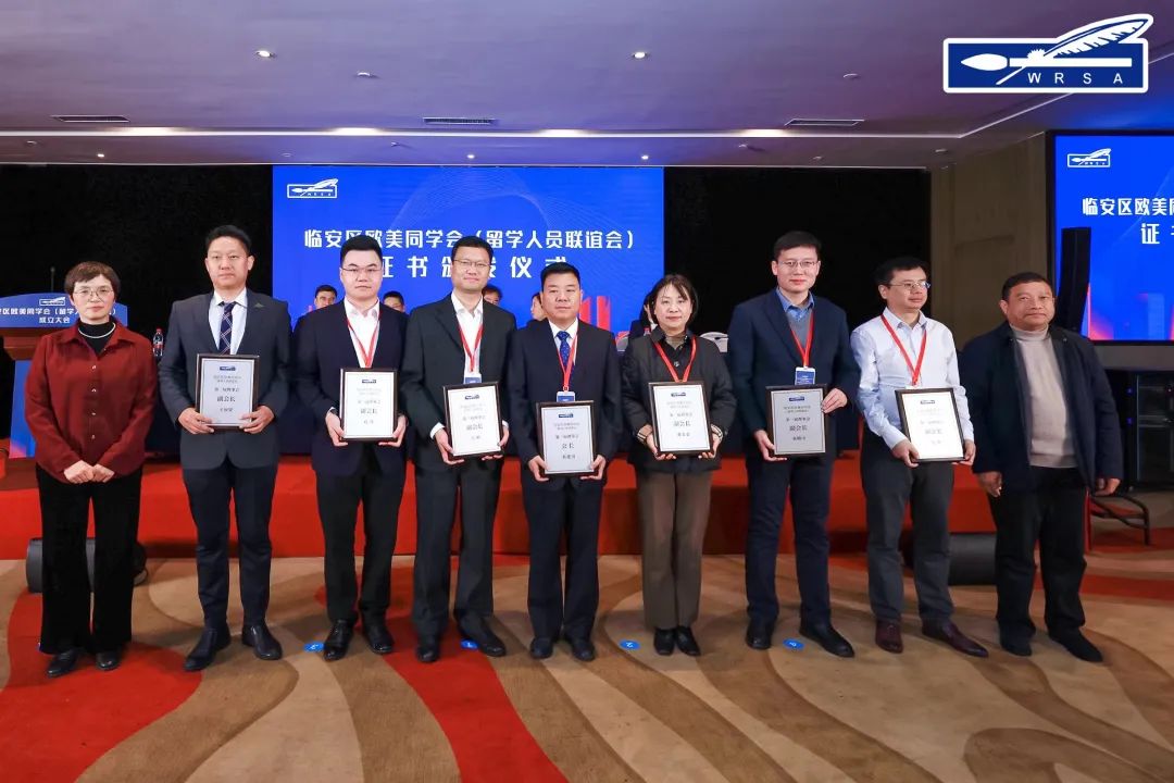 临安区人大常委会副主任吴云海,区政协副主席裘小民,为临安区欧美同学会(留学人员联谊会)第一届会长、副会长颁发聘书