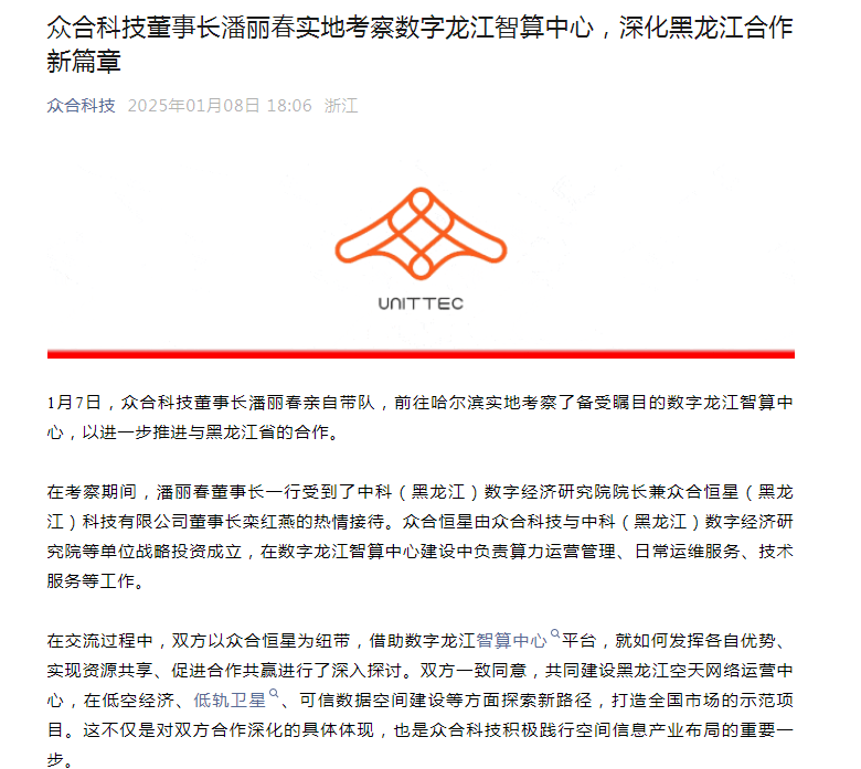近期,众合科技董事长潘丽春亲自率领团队,踏上了前往哈尔滨的考察之旅,目的地在于深入了解并探讨与黑龙江省合作的数字龙江智算中心项目。此次考察标志着双方合作迈入新阶段,共同致力于推动多个前沿领域的创新发展。