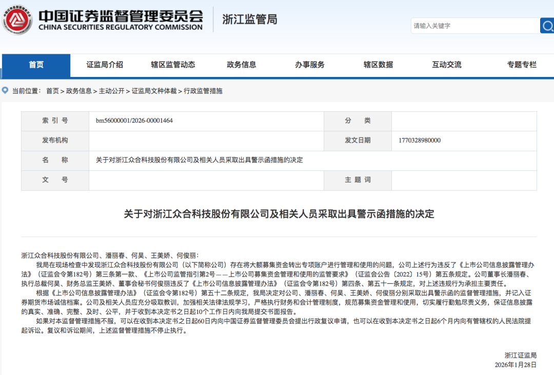 2月6日,浙江证监局发布行政监管措施决定书,对浙江众合科技股份有限公司及董事长潘丽春、执行总裁何昊、财务总监王美娇、董事会秘书何俊丽采取出具警示函的监督管理措施,并记入证券期货市场诚信档案。