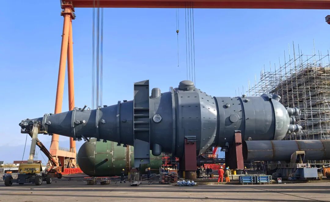 设备总重量达750 吨、最大直径13米、总高度50米,其制造工艺涵盖多段变径(含球面过渡)、多段不同厚度拼接及整体热处理等关键工序,制造精密复杂。