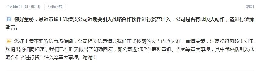 针对投资者的重复提问,兰州黄河27日早间回复表示:请不要听信市场传闻,公司相关信息请以我们正式披露的公告内容为准,审慎决策,注意投资风险!对于您提出的相同问题,我们已在昨天做出了明确回复,即公司近期没有筹划重组、借壳等重大事项,其中就包括引入战略合作者进行资产注入等重大事项。