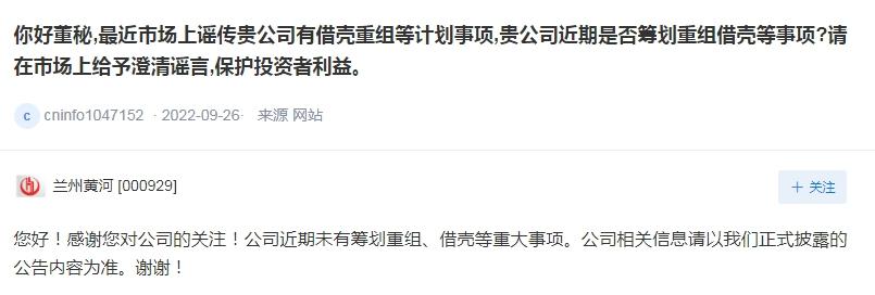 兰州黄河26日回复提问称,公司近期未有筹划重组、借壳等重大事项。