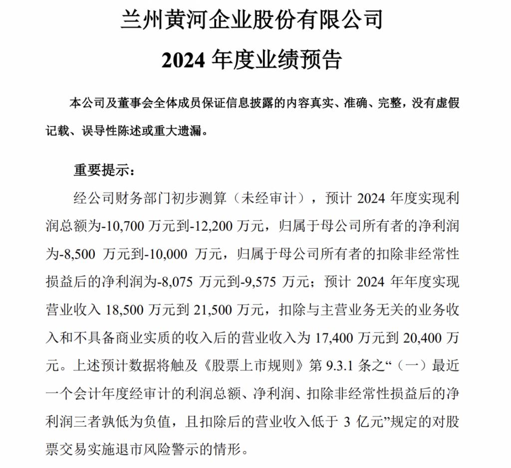 近日,兰州黄河( SZ000929 )发布 2024 年度业绩预告。