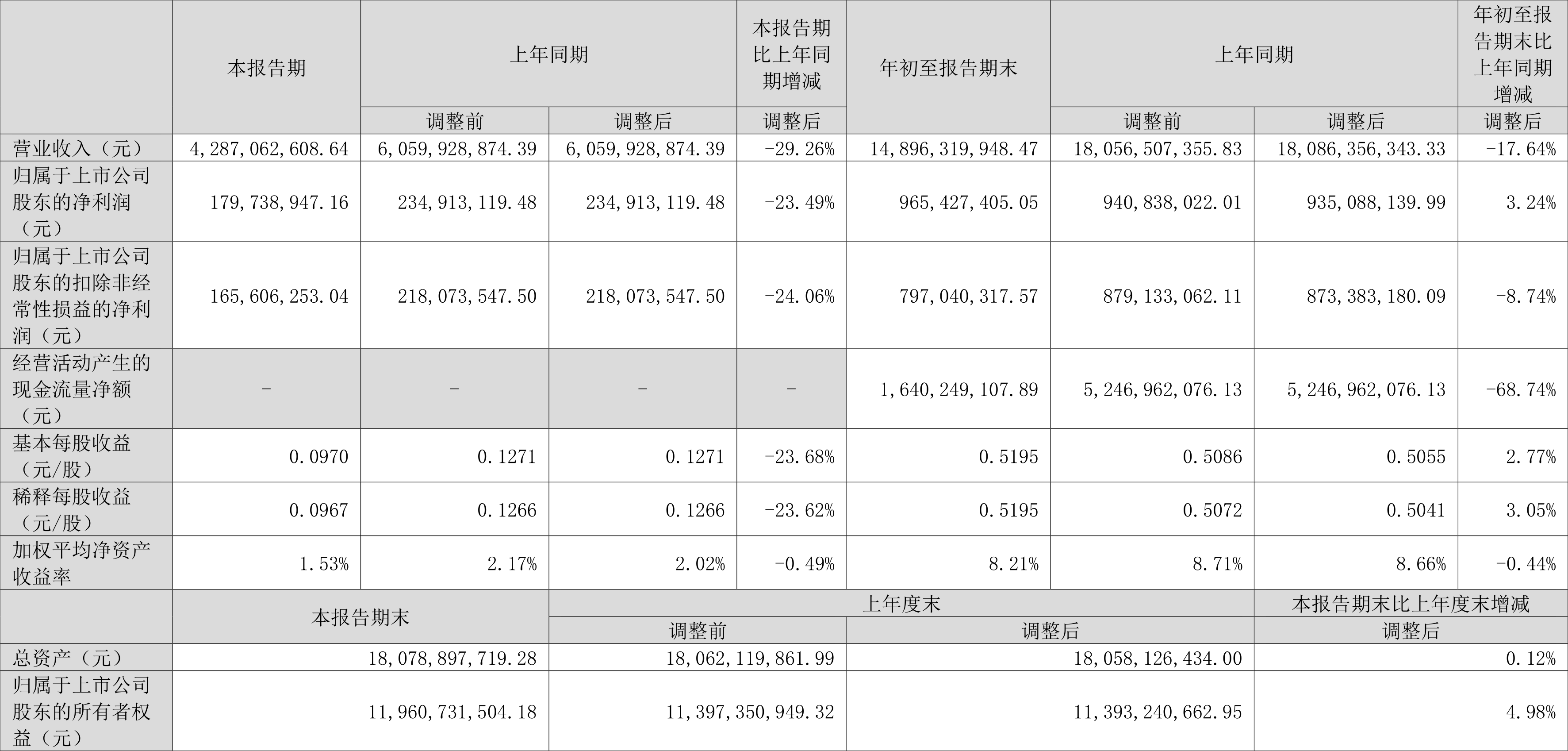 根据三季报,公司第三季度实现营业总收入42.87亿元,同比下降29.26%,环比下降18.02%;归母净利润1.8亿元,同比下降23.49%,环比下降58.84%;扣非净利润1.66亿元,同比下降24.06%,环比下降51.13%。