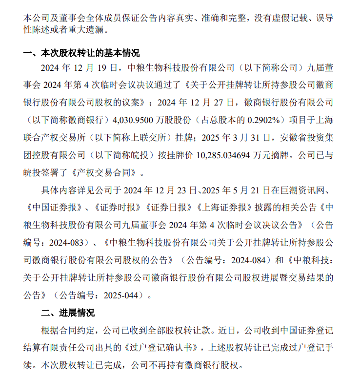公告指出,中粮科技在2024年12月19日的董事会会议上决议通过了转让该股权的议案,并于2025年3月31日以1.03亿元的挂牌价将上述股份转让给安徽省投资集团控股有限公司。根据合同约定,中粮科技已收到全部股权转让款,并于近日确认该股权转让已完成过户登记手续。此次交易后,中粮科技不再持有徽商银行的股权。