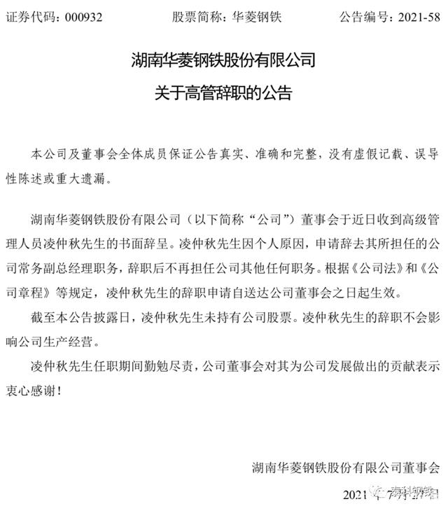 华菱钢铁7月27日发布公告称,凌仲秋先生因个人原因,申请辞去其所担任的公司常务副总经理职务,辞职后不再担任公司其他任何职务。截至本公告披露日,凌仲秋先生未持有公司股票。
