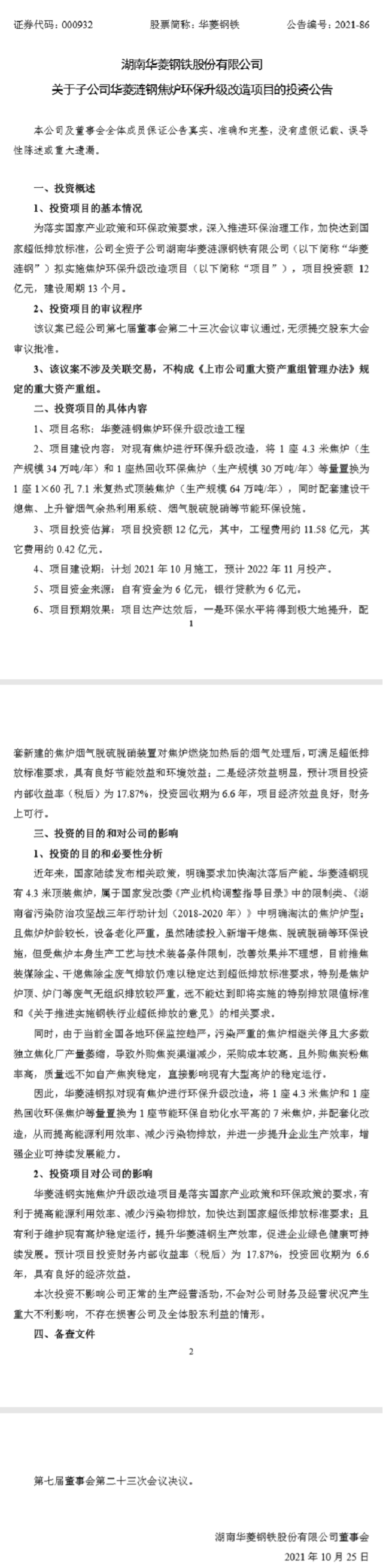 为落实国家产业政策和环保政策要求,深入推进环保治理工作,加快达到国家超低排放标准,公司全资子公司湖南华菱涟源钢铁有限公司(以下简称“华菱涟钢”)拟实施焦炉环保升级改造项目(以下简称“项目”),项目投资额12亿元,建设周期 13 个月。