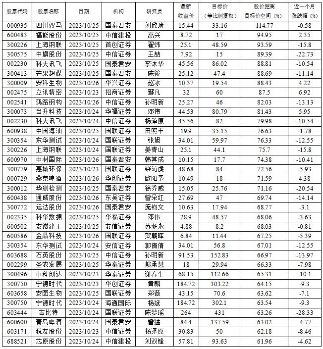 从给出具体目标价的公司来看,66家公司收盘价距券商研究员给出的目标价还有逾五成的空间。其中,空间最大的是四川双马(000935)。国泰君安研究员刘欣琦在10月25日发表题为《四川双马:公司回购彰显信心,看好长期增长》回购股份事件点评中指出,四川双马回购彰显信心,私募股权业务加速推进下,看好未来业绩增长,维持目标价33.16元。按公司周五收盘价15.44元计算,股价还有114.77%的向上空间。
