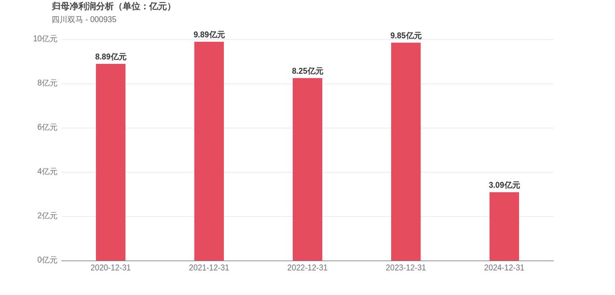 利润角度分析,2020年四川双马实现归母净利润8.89亿元,2024年3.09亿元。近年来归母净利润波动较大,2024年同比大幅下降68.61%。